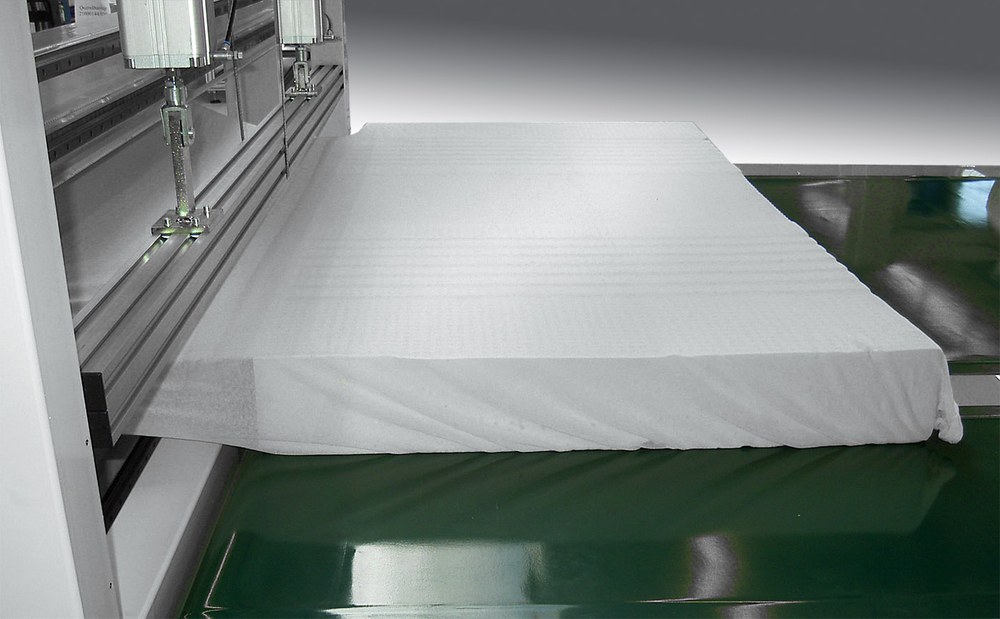 Fixier- und Komprimiereinrichtung (integriert in die Quernähstation) zum Abpressen und Fixieren der beiden gegenüberliegenden, trikotierten Matratzen während des Quernäh- und Schneidprozesses