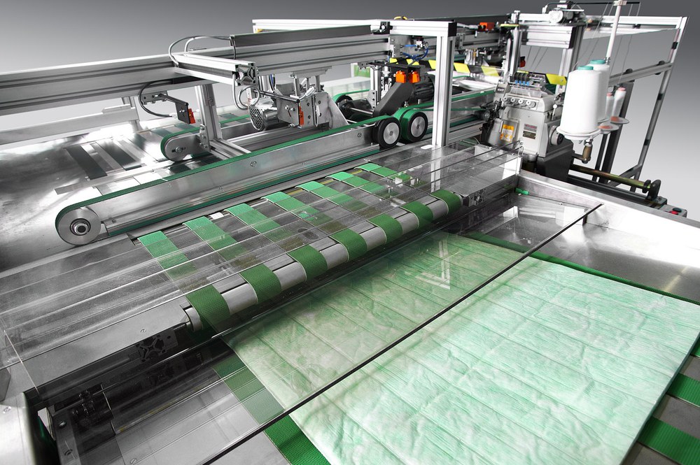 Movable Pegasus 4-thread double needle overlock sewing machines (left/right) for manufacture of filter pockets with tapered or straight side seam (electro-motorically controlled, corresponding to the speed of the unit)